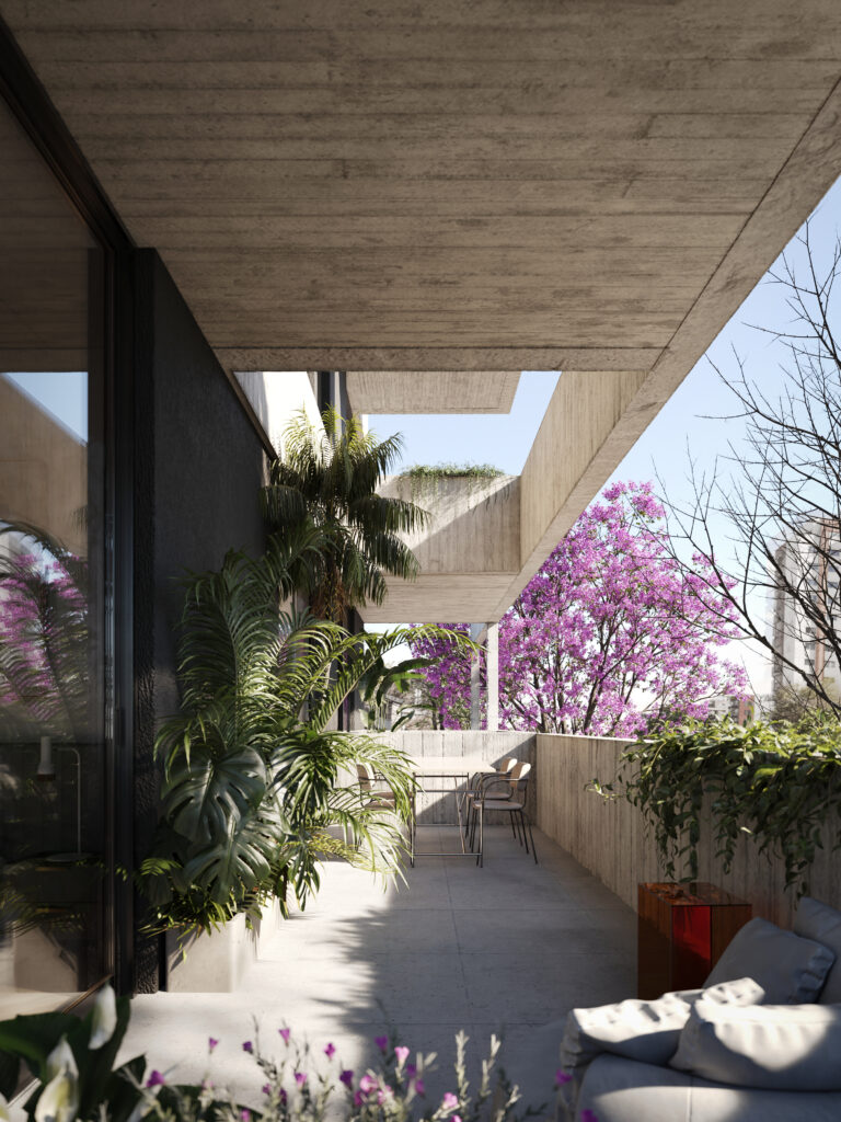 Su arquitectura contemporánea se expresa a través de grandes ventanales, balcones integrados y una cuidada disposición de los espacios, pensados para que la luz y la ventilación natural acompañen cada departamento.